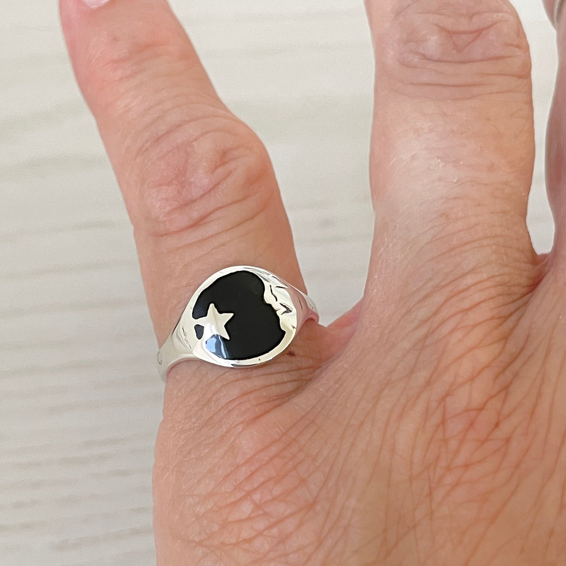 Black Agate Sterling Silver Ring: Moon Face Star Celestial Jewelry