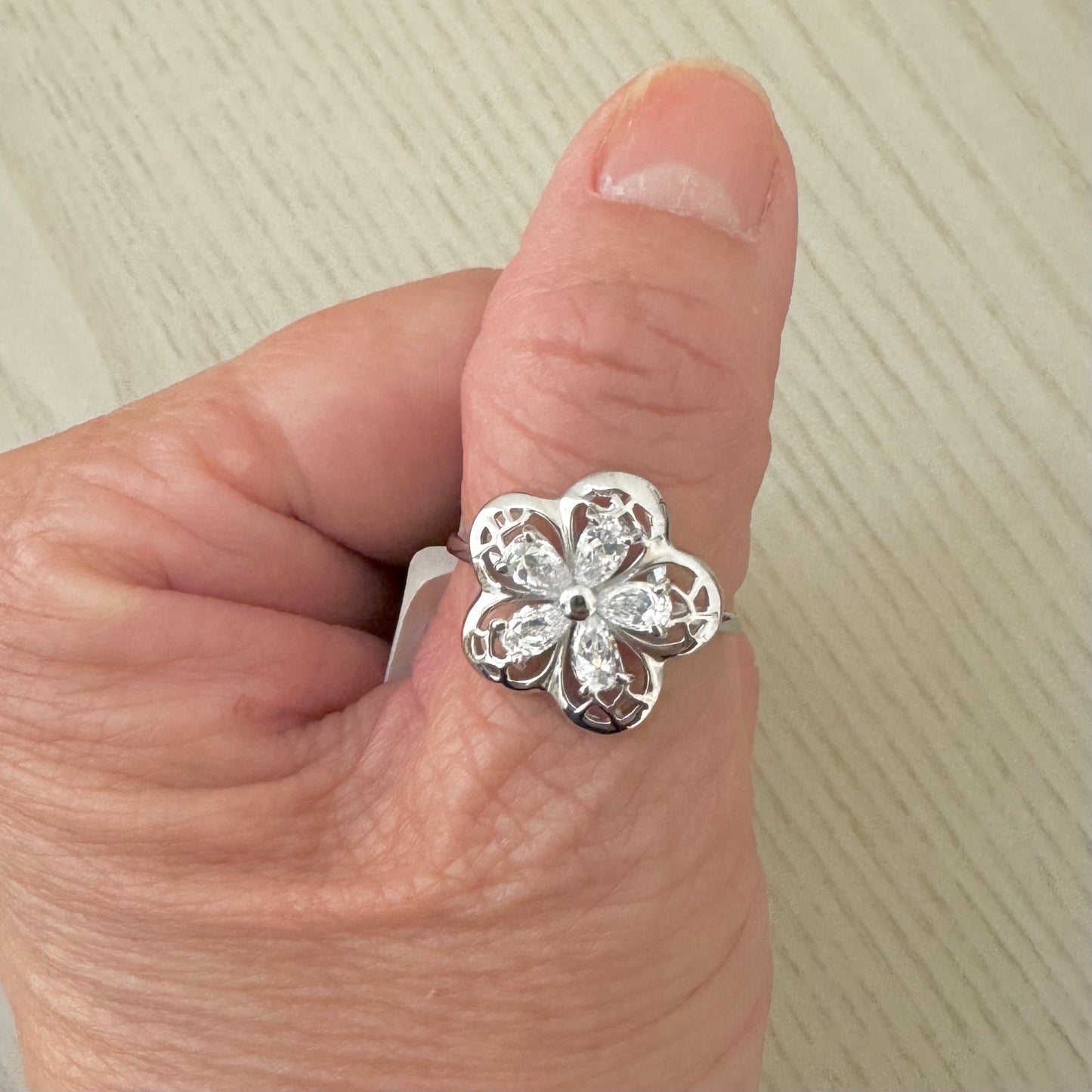 • Sterling Silver Plumeria CZ Teardrop Ring, Dainty Band Ring, Silver Filigree Flower Ring, Statement CZ Flower Ring, CZ Flower Promise Ring, I Love You, Thank You Ring, May be worn on any finger 925 Stamped.