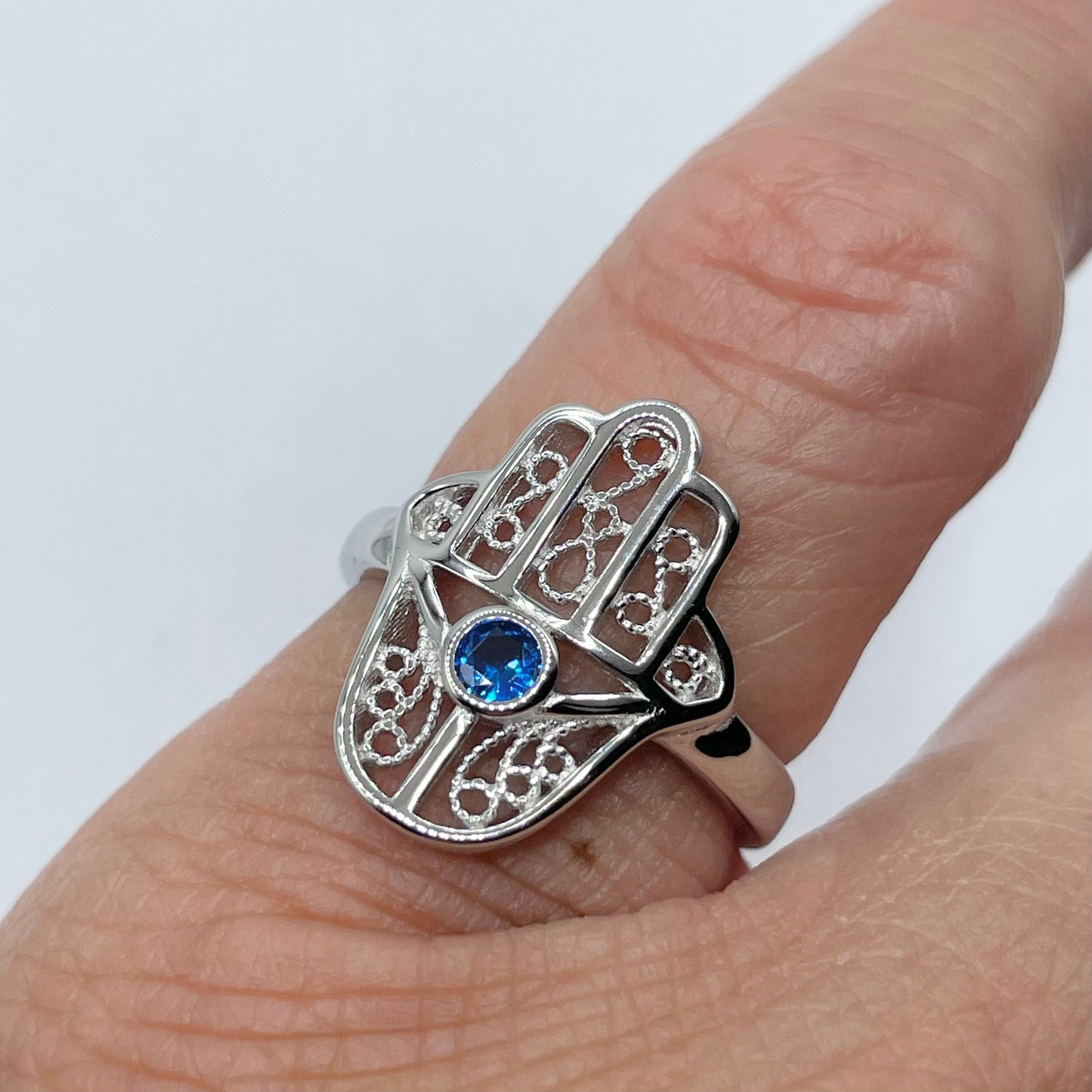 • Sterling Silver Hamsa Tiny Blue Sapphire CZ Ring, Hand of God Ring, Religious Ring, Hamsa Promise Ring, Silver Ring, Statement Ring, Love Ring, Boho Ring, Eye Ring, 925 Stamped