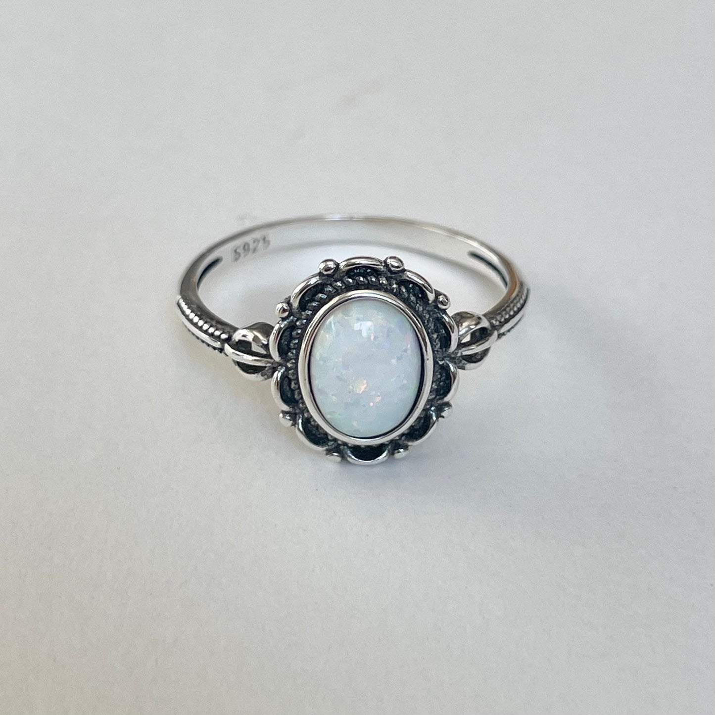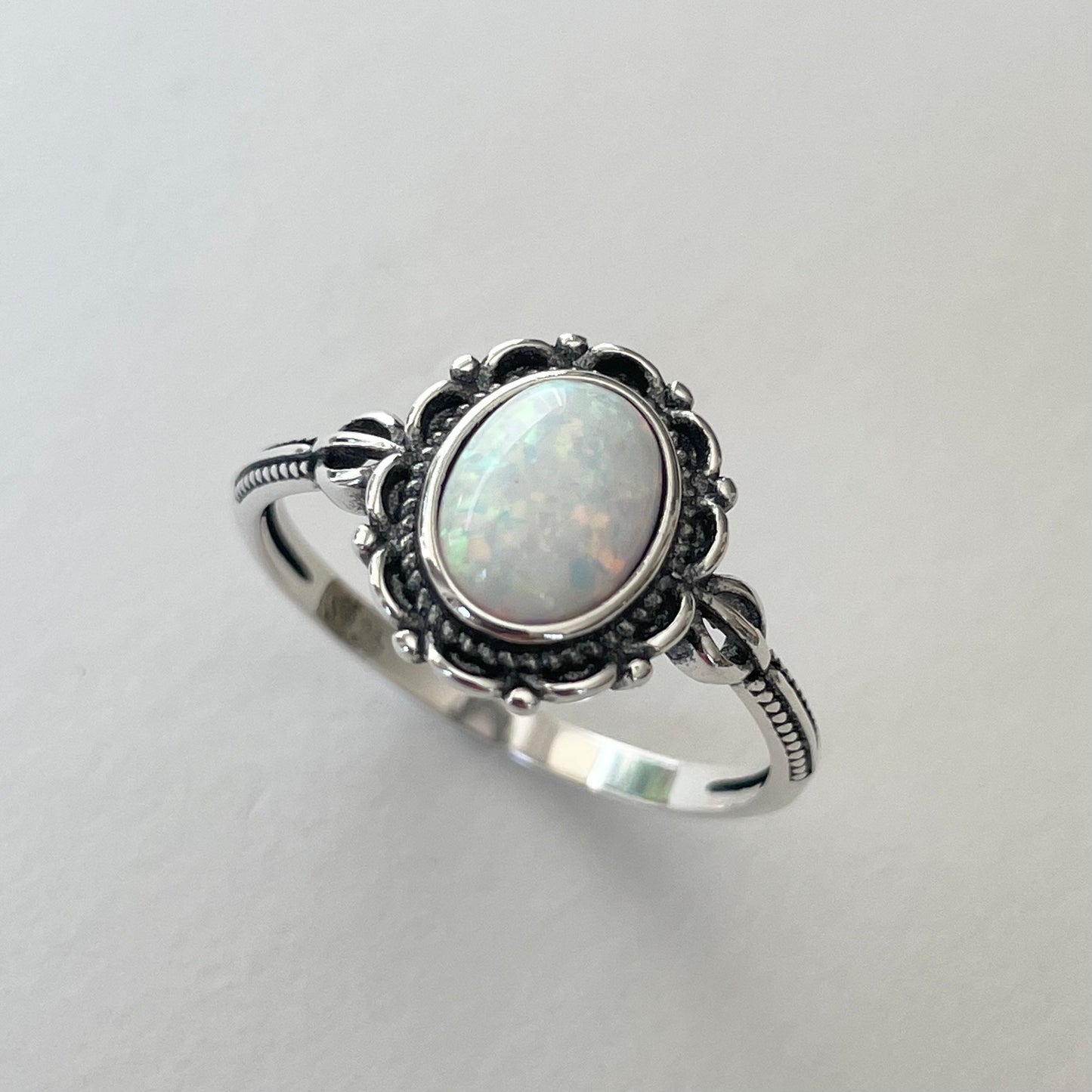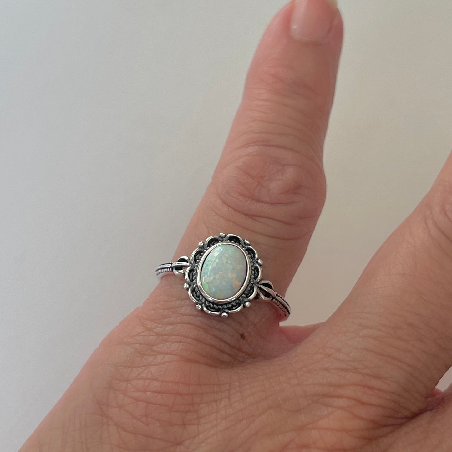 • Sterling Silver Pretty Victorian Flower White Lab Opal Ring, Silver Ring, Boho Ring, Old Fashion Ring, Silver Opal Ring, Promise Love Ring, Wedding, Floral Silver Ring, Flower Ring, may also be worn as a midi ring, or as a thumb ring, 925 Stamped.